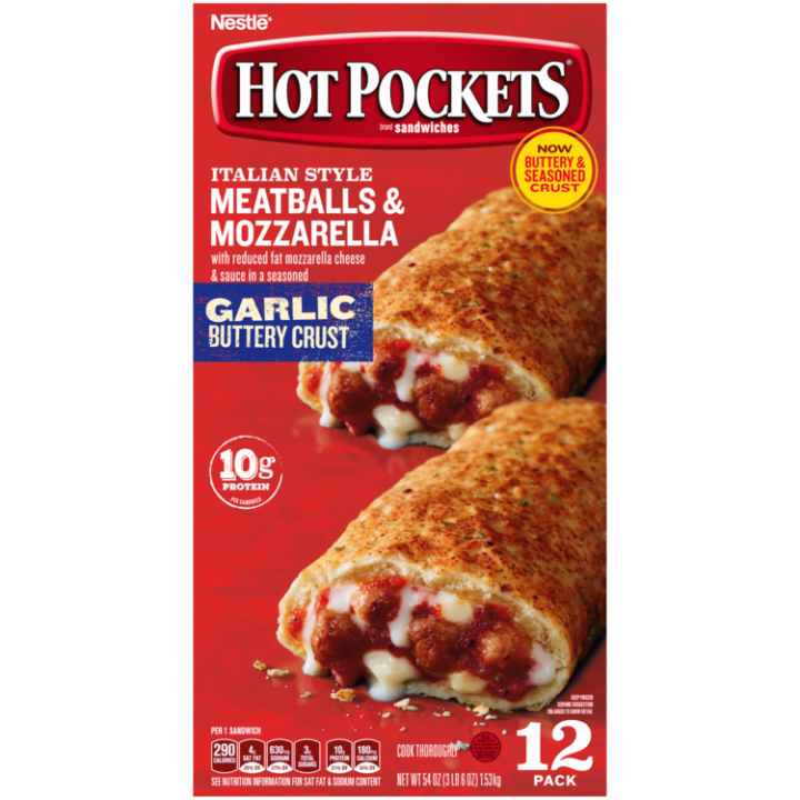 HOT POCKETS are the perfect solution. Nestle Hot Pockets Meatballs and Mozzarella 9 Ounce -- 8 per case. 10 grams of protein per serving.